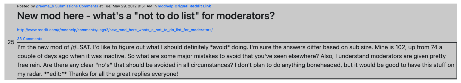 5/29/12: New mod here - what's a "not to do list" for moderators? "I understand moderators are given pretty free rein..." Only months later, Blake starts requesting other test-prep subreddits.