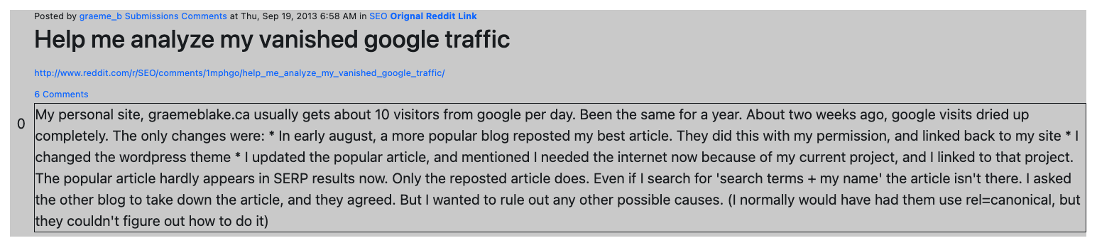 9/19/13: Help me analyze my vanished google traffic. Notes that his own LSAT tutoring website is very unpopular on Google, with zero visits per day. Better double down on Reddit, then!