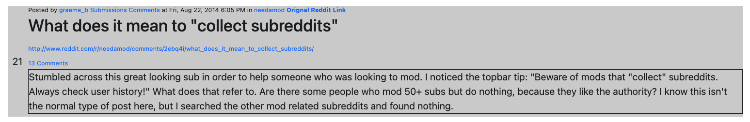 8/22/14: What does it mean to "collect subreddits"? Discovers a derogatory term ("collecting subreddits") for what he has been trying to accomplish over the past 2 years. "Are there people who mod 50+ subs...because they like the authority?" Yes, Graeme, there are. In fact, you might find that you and they have quite a lot in common.