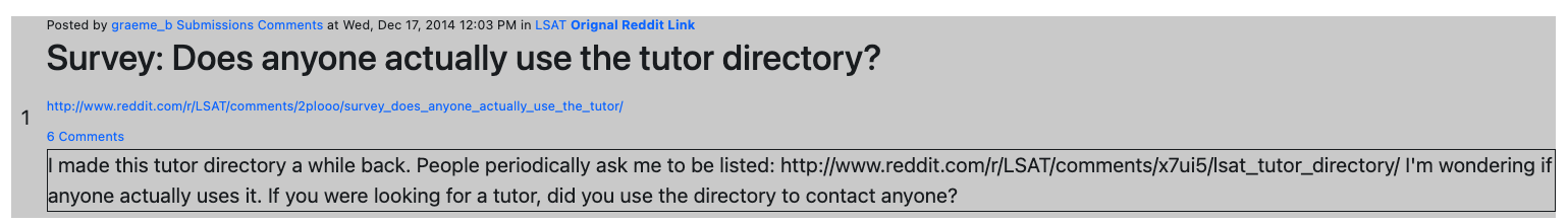 12/27/14: Survey: Does anyone actually use the tutor directory? Perhaps insecure about the ethical ramifications of posting a woefully incomplete "Reddit LSAT Tutor Directory" with his name listed at the very top, Graeme asks whether anyone actually uses it. "Is there anyone out there?" Blake can't possibly figure out why the scam isn't working / he can't find students -- even though Reddit users are notoriously savvy readers, critical thinkers, and consumers.