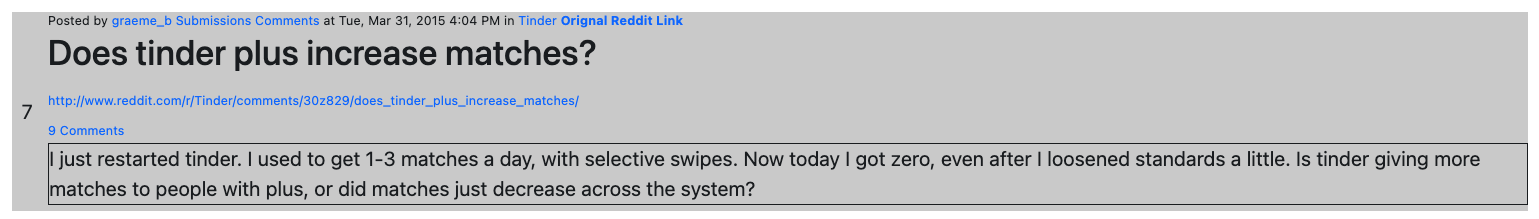 3/31/15: Does Tinder Plus Increase Matches? "I just restarted Tinder. I used to get 1-3 matches a day, with selective swipes. Now today I got zero, even after I loosened standards a little!" Cringe.