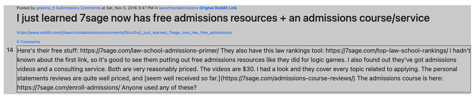 11/5/16: I just learned 7Sage now has free admissions resources + an admissions course/service. Begins mysteriously promoting 7Sage over other LSAT prep companies -- right around the time he was hired by 7Sage as VP of Curriculum Development.
